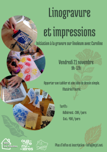 Initiation à la gravure sur linoleum avec Caroline. Apporter son tablier et une idée de dessin simple. Le matériel est fourni.